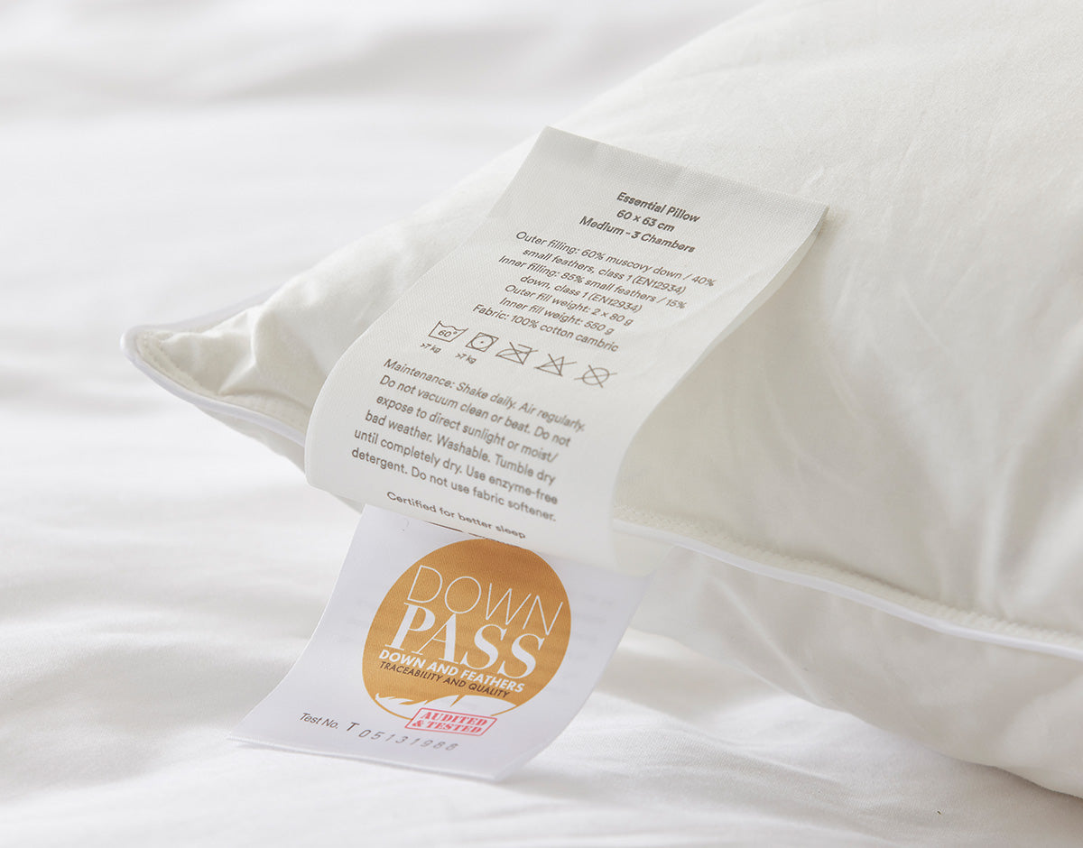 Essential-dunpuden er OEKO-TEX®-certificeret og fyldt af Downpass-certificerede dun og fjer, der er vores garanti for, at puden lever op til strenge krav for dyrevelfærd, samt etisk og kvalitetsmæssig integritet. Puden er inddelt i tre kamre for ergonomisk korrekt støtte. Det midterste kammer er fyldt med småfjer, der sikrer god højde, imens de ydre kamre er fyldt med 60% andedun for blødhed og 40% småfjer for yderligere støtte. Kamrene er omkranset af et pudevår i 100% bomuld.
