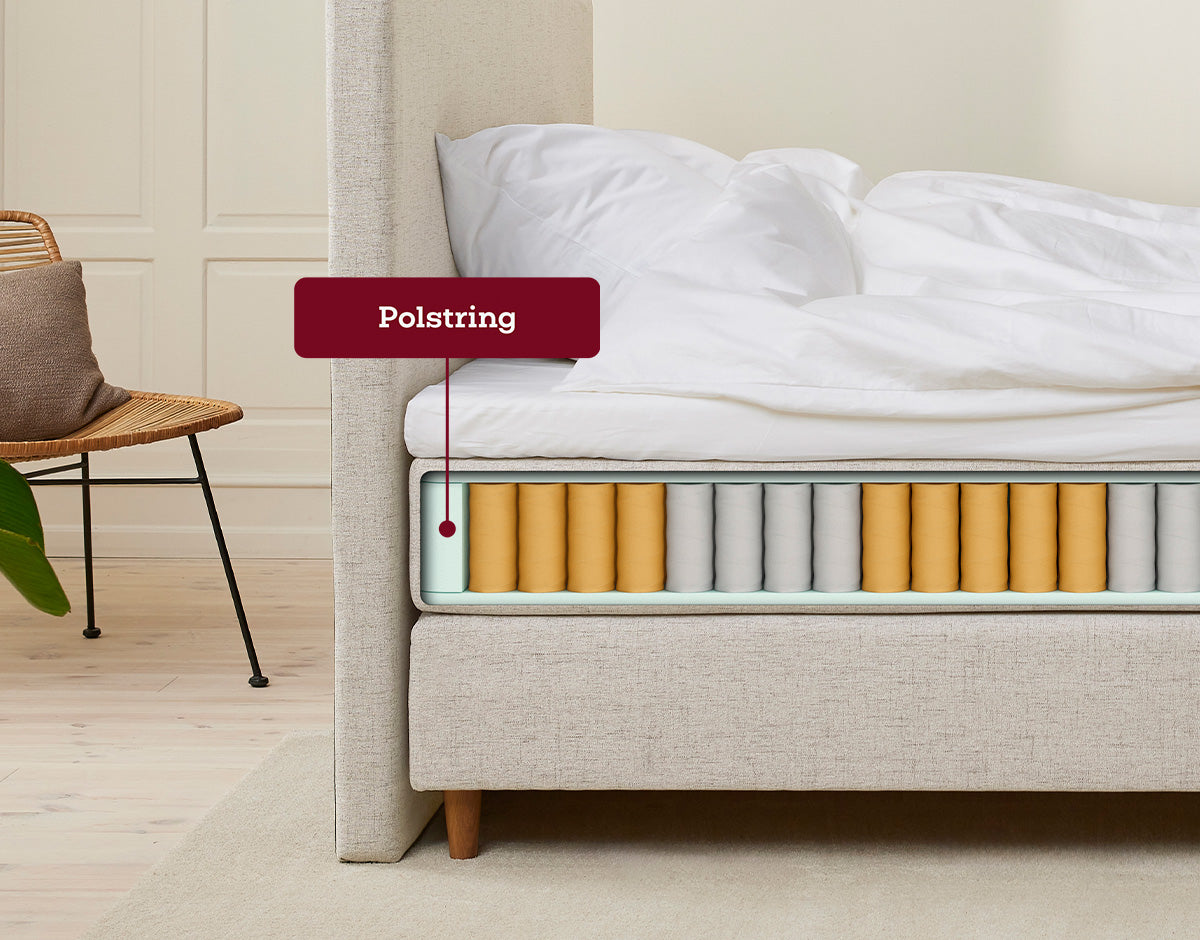 Det er utrolig vigtigt for os kun at sælge senge af den bedste kvalitet, da ordentlige materialer går hånd i hånd med god søvn. Derfor er springmadrassens pocketfjedre omkranset af en polstring i mintskum med en åben cellestruktur, som sørger for god varmeafledning og ikke mindst en lang levetid på madrassen, da ventilation er vigtig for at opretholde et sundt sovemiljø. Springmadrassen er til sidst indhyllet i et OEKO-TEX®-certificeret møbeltekstil.