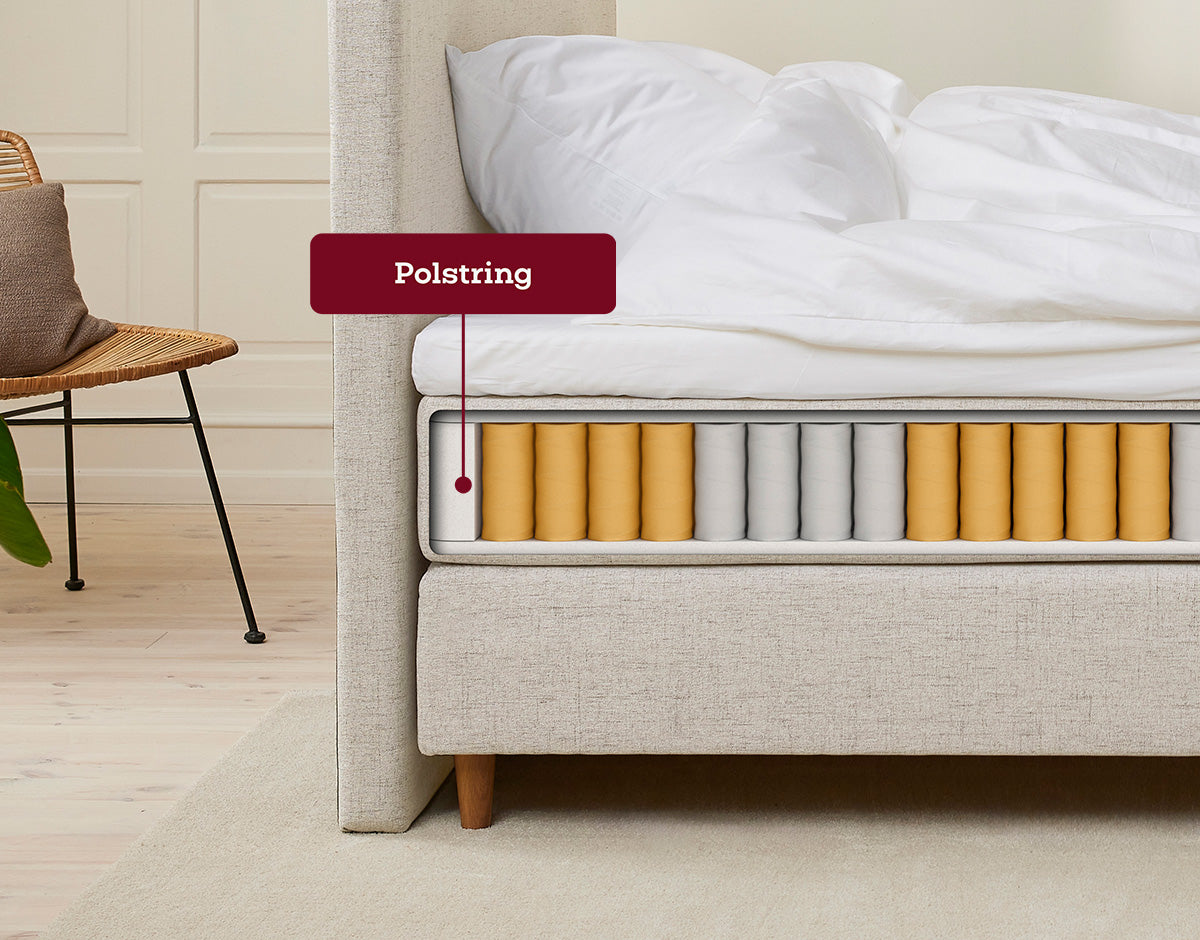 Vores kontinentalsenge består af tre lag: en holdbar boxmadras, en fleksibel springmadras og en luksuriøs topmadras.