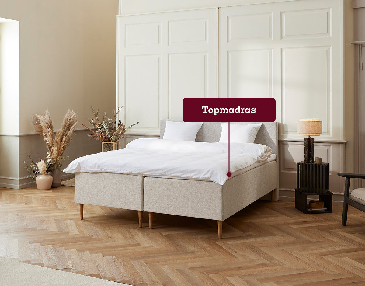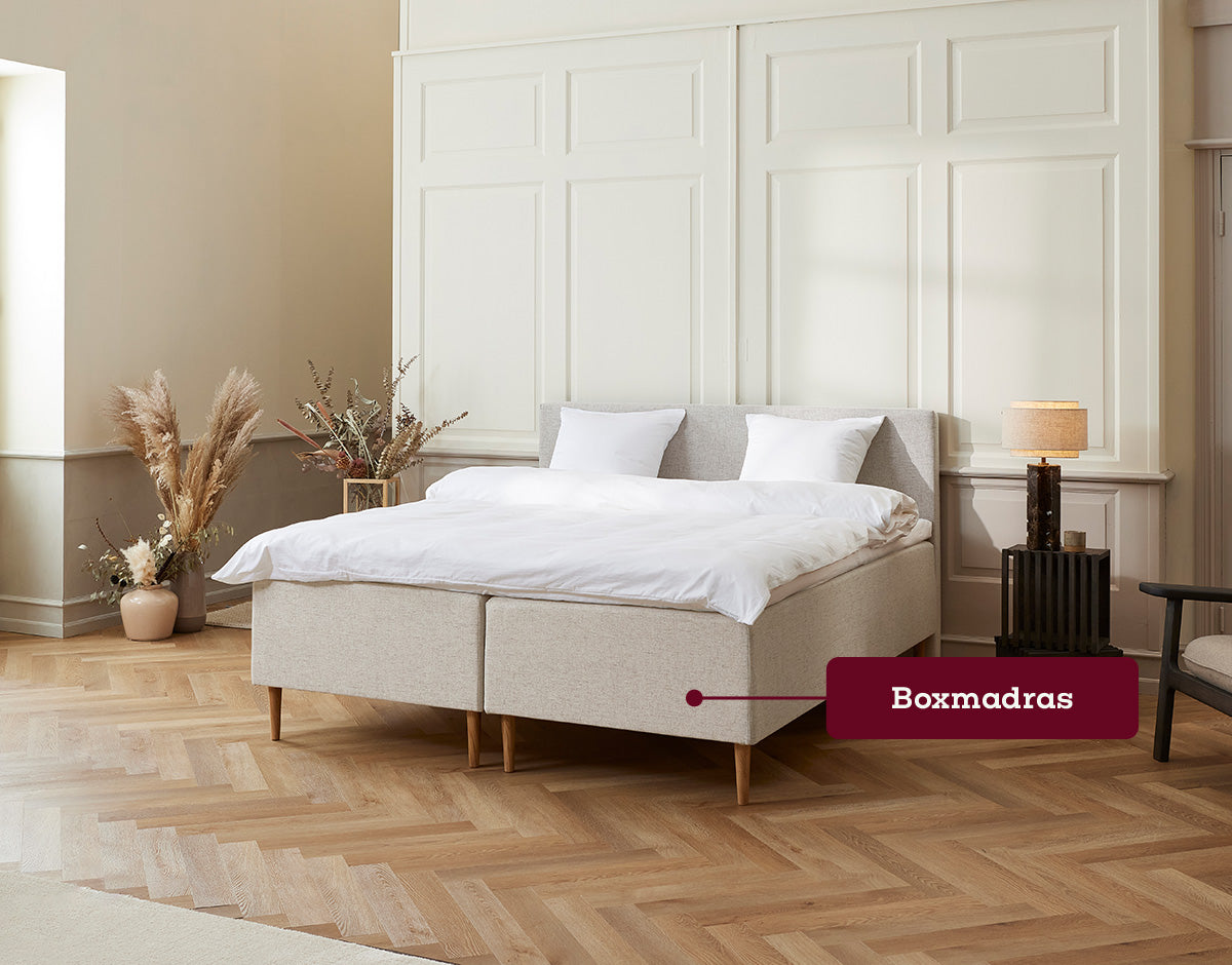Vores boxmadrasser består af en solid træramme med to fjedrelag og en luksuriøs topmadras. Bliv klogere på sengens forskellige lag herunder.