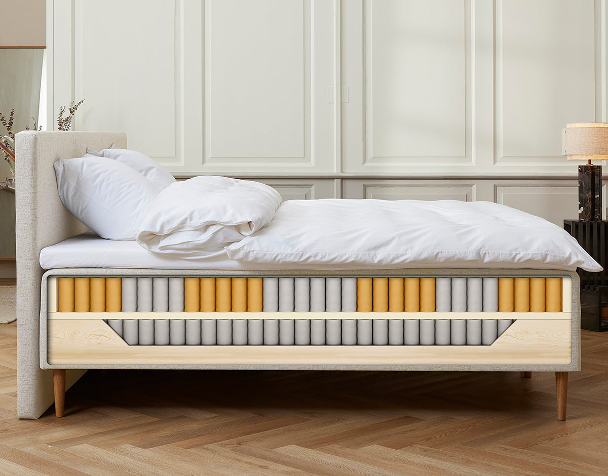 Boksmadrassen har to lag fjedre, der begge består af individuelle pocketfjedre, som er kendetegnet for stor fleksibilitet og støtte. Pocketfjedrene er inddelt i syv komfortzoner og er placeret i en 20 cm høj træramme i FSC-certificeret svensk fyrretræ. Polstringen består af 25 mm ventilerende skum.