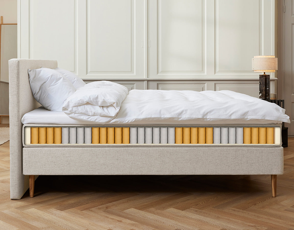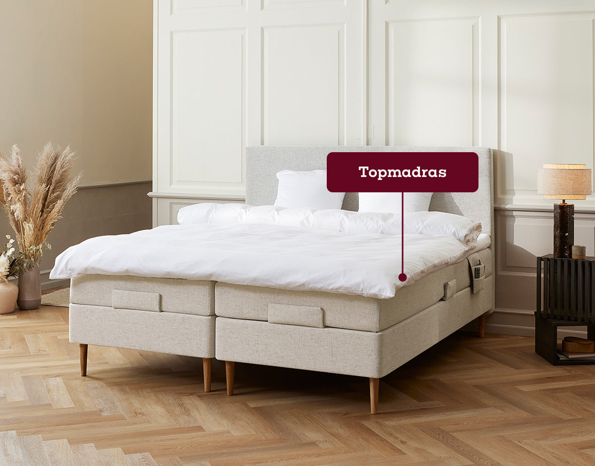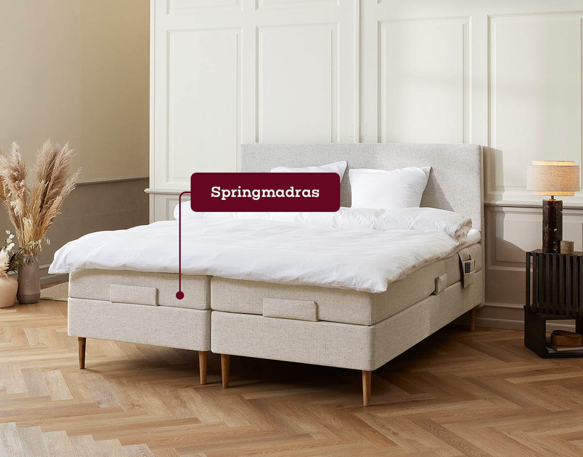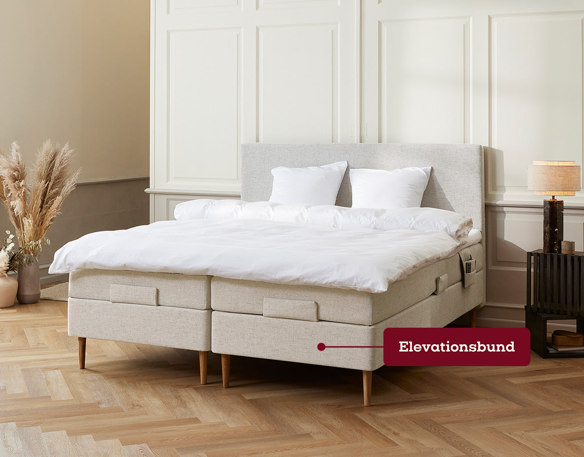 Vores elevationssenge består af en funktionel elevationsbund med motor og lameller, en fleksibel springmadras og en luksuriøs topmadras. Bliv klogere på sengens forskellige lag herunder.