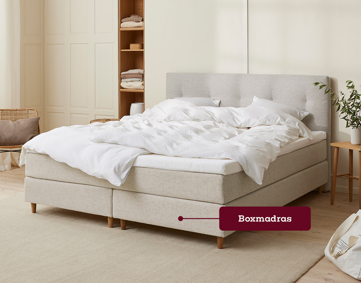 Boksmadrassen er sengens base, hvorpå sengens øvrige madrasser ligger. Denne boksmadras er skabt af en 12 cm høj og 4 cm tyk ramme i FSC-certificeret fyrretræ fra Sverige og er fuldendt af et 8 cm tykt lag komfortskum.