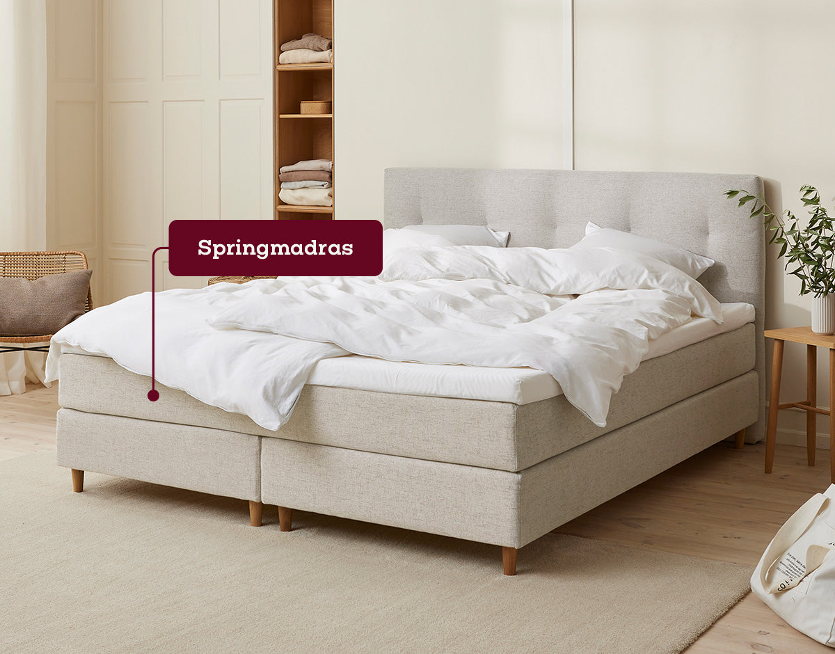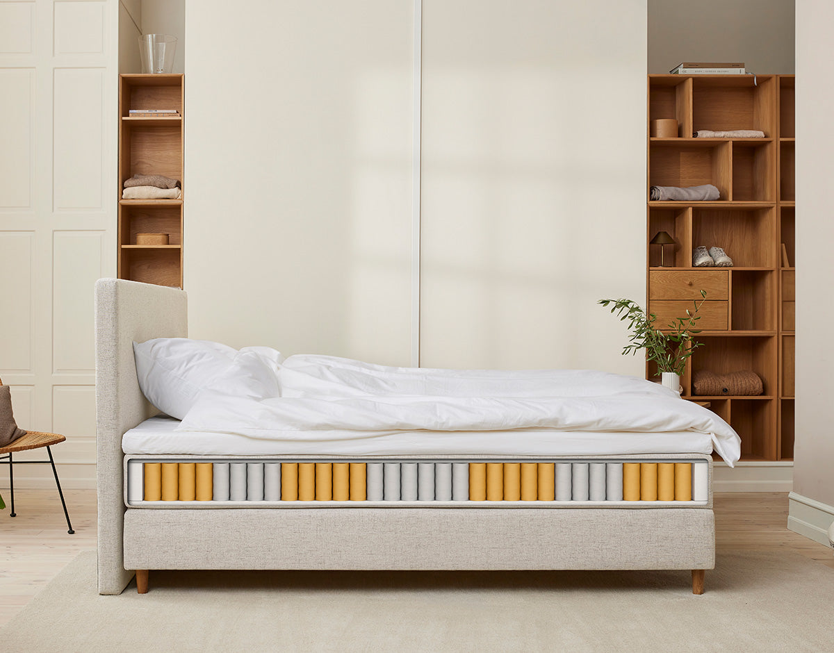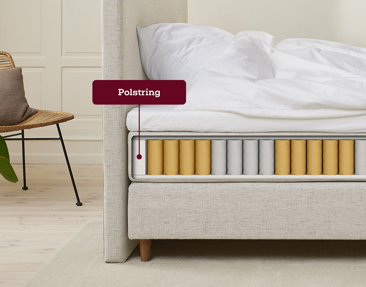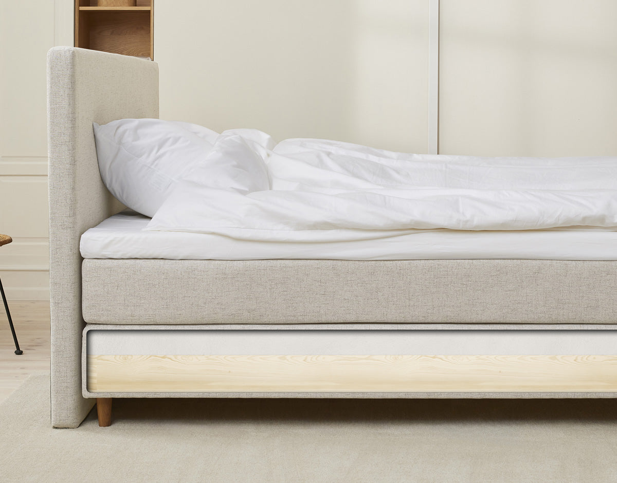 Vores kontinentalsenge består af tre lag: en holdbar boxmadras, en fleksibel springmadras og en luksuriøs topmadras.