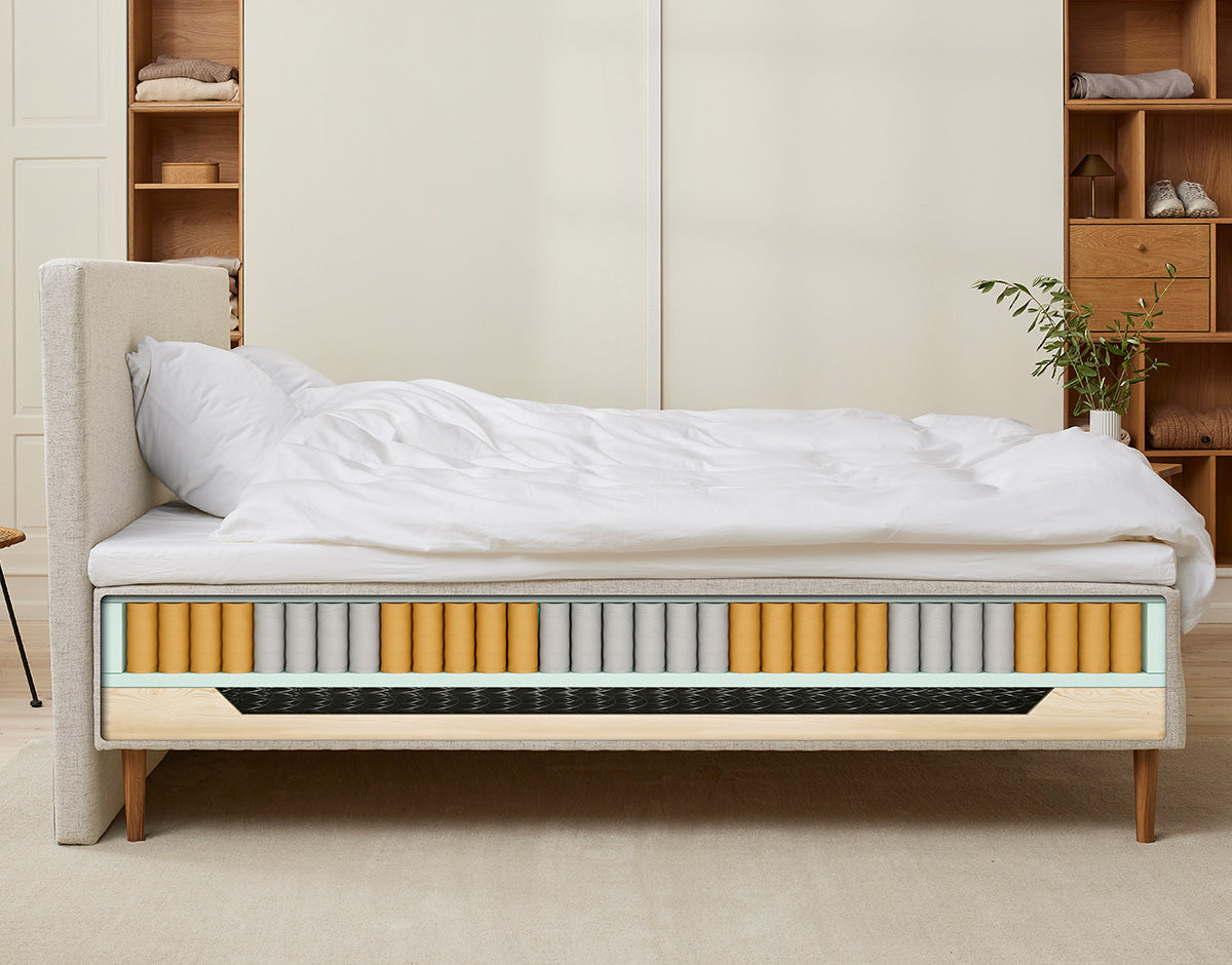 Nederst i trærammen ligger et lag bonellfjedre, der er kendetegnet ved at være forbundet med hinanden, hvilket vil sige, at dit kroppens tryk påvirker hele liggefladen, hvorimod pocketfjedrene, i det øverste lag, arbejder individuelt og yder en differentieret støtte alt afhængig af, hvor du placerer din vægt i løbet af natten. Pocketfjedrene er derudover inddelt i syv komfortzoner, så alle dele af kroppen bliver mødt med ergonomisk korrekt støtte.
