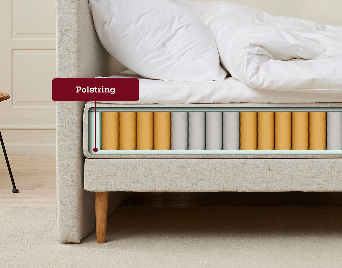 Det er utrolig vigtigt for os kun at sælge senge af den bedste kvalitet, da ordentlige materialer går hånd i hånd med god søvn. Derfor er springmadrassens pocketfjedre omkranset af en polstring i mintskum med en åben cellestruktur, som sørger for god varmeafledning og ikke mindst en lang levetid på madrassen, da ventilation er vigtig for at opretholde et sundt sovemiljø. Springmadrassen er til sidst indhyllet i et OEKO-TEX®-certificeret møbeltekstil.