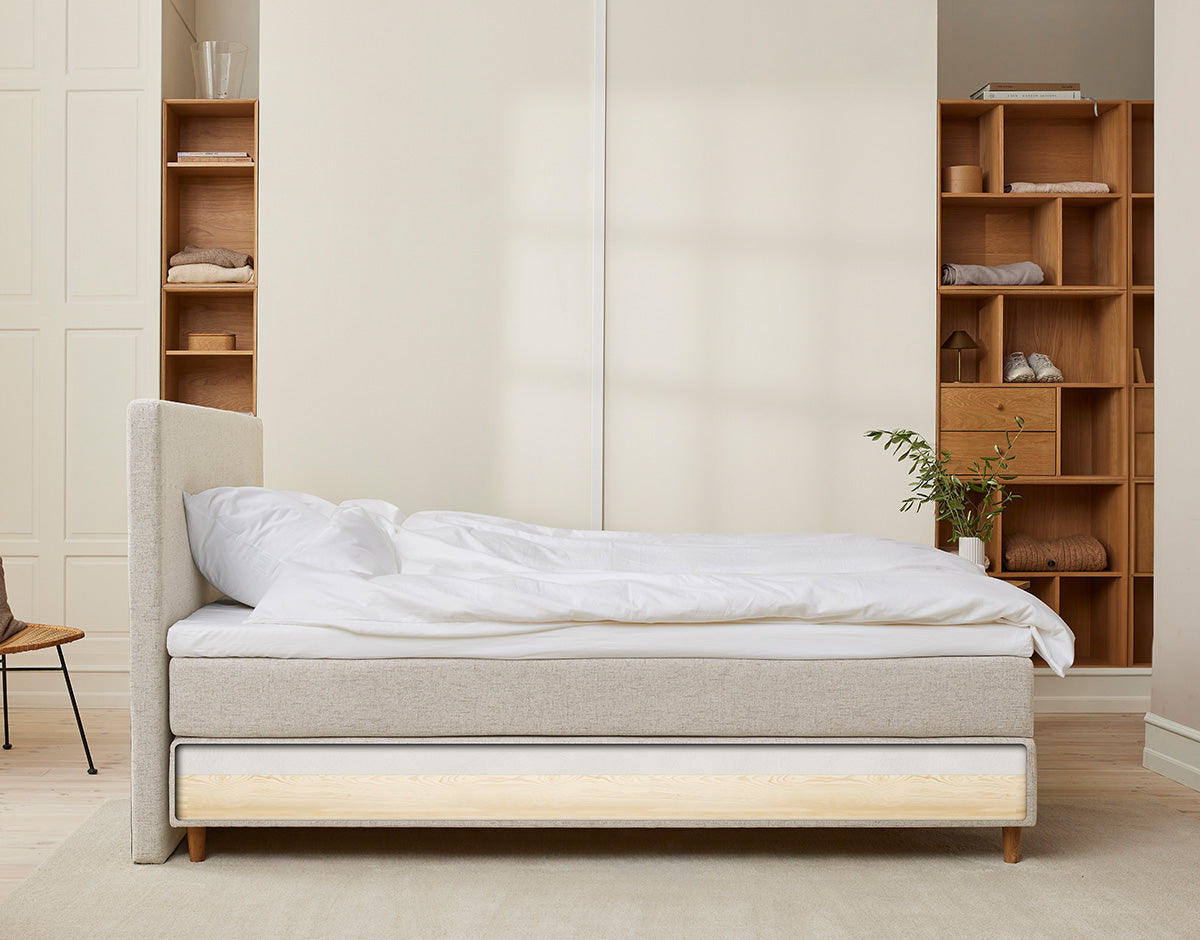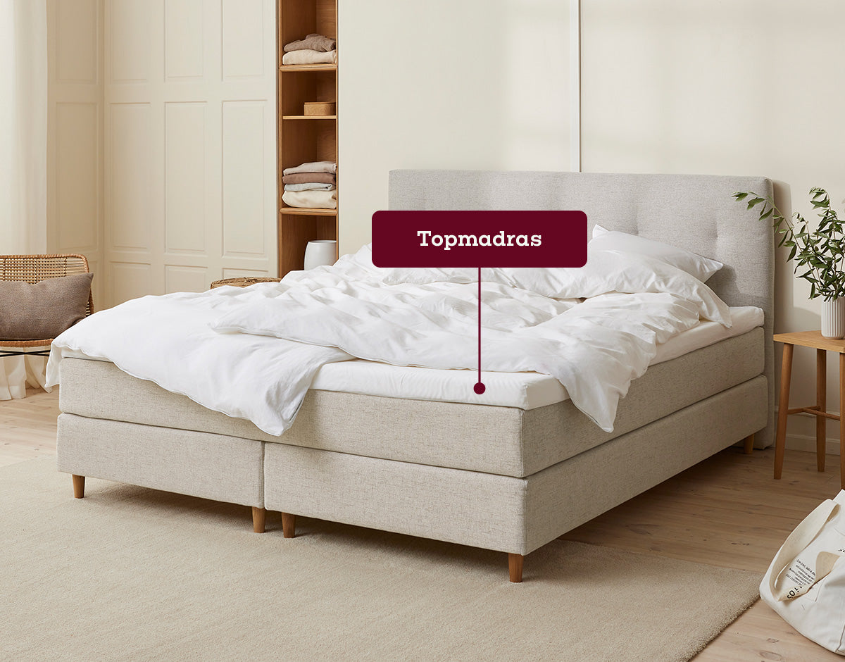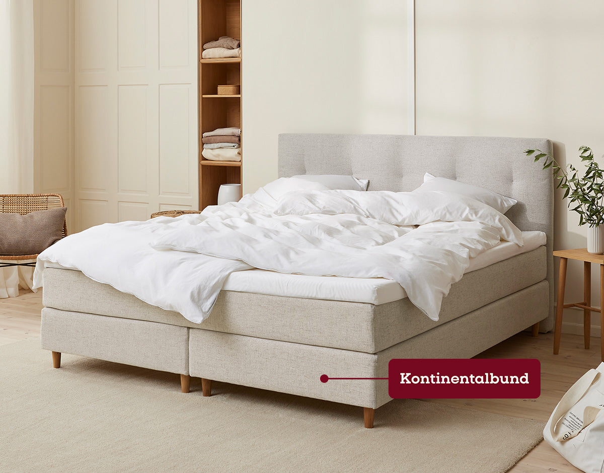 Vores kontinentalsenge består af tre lag: en holdbar boxmadras, en fleksibel springmadras og en luksuriøs topmadras.