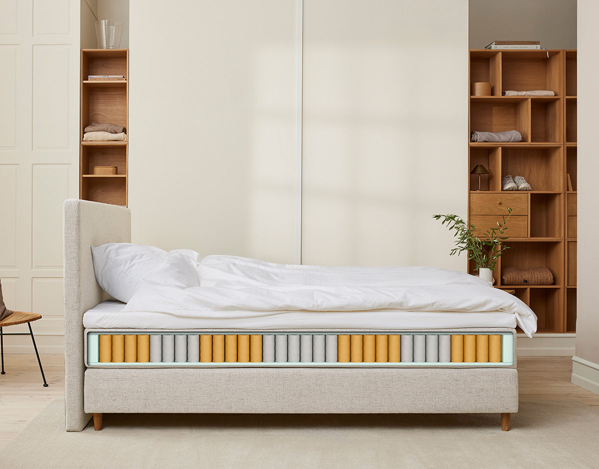 Det er utrolig vigtigt for os kun at sælge senge af den bedste kvalitet, da ordentlige materialer går hånd i hånd med god søvn. Derfor er springmadrassens pocketfjedre omkranset af en polstring i mintskum med en åben cellestruktur, som sørger for god varmeafledning og ikke mindst en lang levetid på madrassen, da ventilation er vigtig for at opretholde et sundt sovemiljø. Springmadrassen er til sidst indhyllet i et OEKO-TEX®-certificeret møbeltekstil.