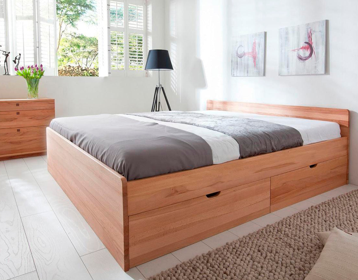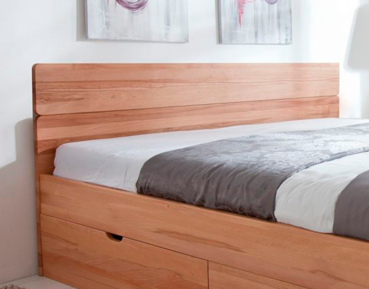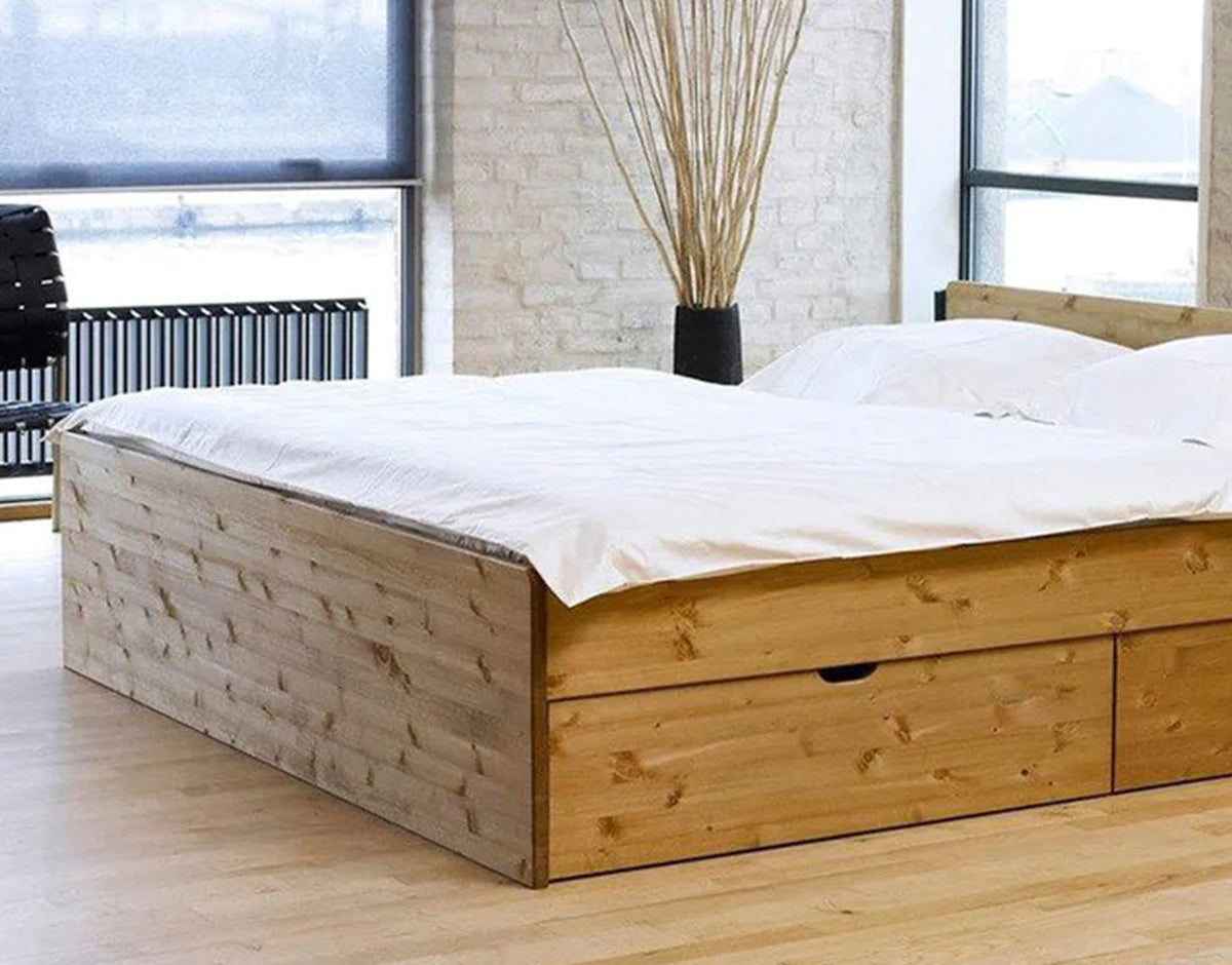 Smart sengeramme med indbyggede sengeskuffer i massiv fyrretræ eller kernebøg fra Sverige. Trætykkelsen måler 25 mm og sengegavlen er 60 cm høj og fodenden 45 cm høj.