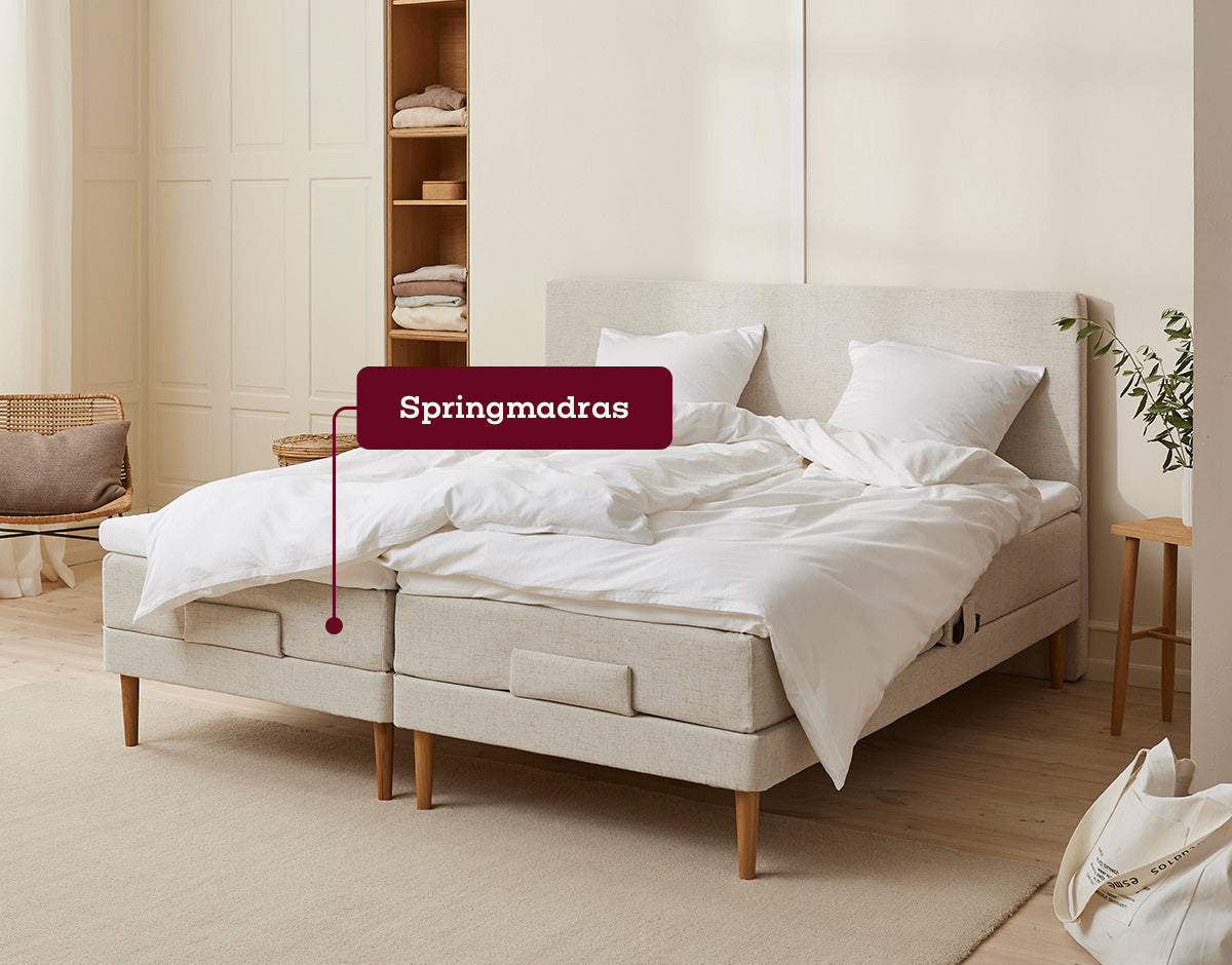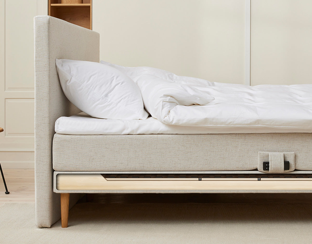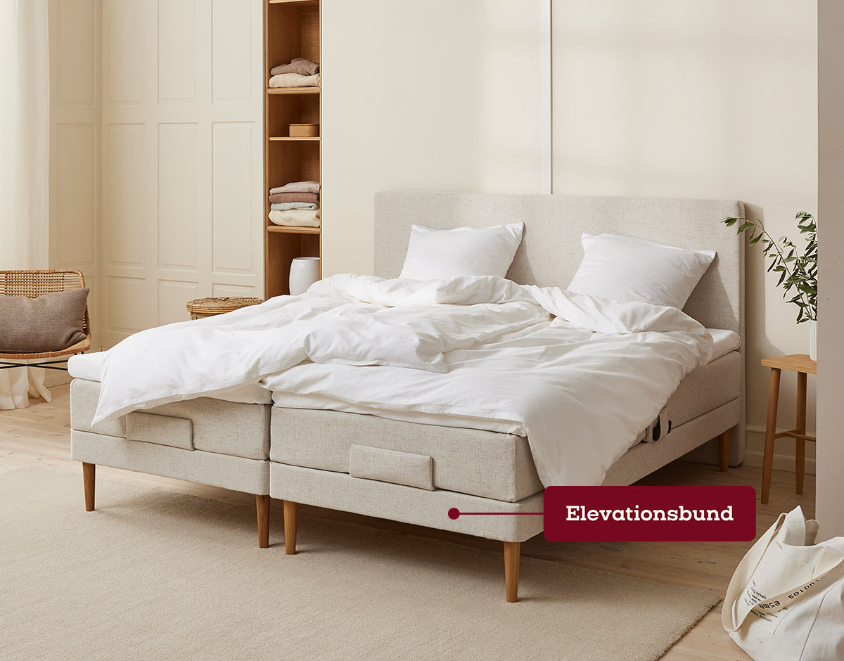 Vores elevationssenge består af en funktionel elevationsbund med motor og lameller, en fleksibel springmadras og en luksuriøs topmadras. Bliv klogere på sengens forskellige lag herunder.